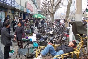 这是一个上海街头的场景。如果用于中文初学者,可用来向他们说明“有许多自行车”、“天气很冷”、或者是“一个男的在睡觉”;如果用于在学习高级中文的学生,他们可能会猜为什么这个男的在睡觉?图片左方两个人在聊什么?或者比较这跟他们自己所在的城市街道场景有何不同。通过投影机把它放映到教室的前面,一张图片就可以把学生从校园转移到另一个不同的世界。从本质上来讲,通过一个工具提供一些学生不可预知的内容,可以鼓励他们参与进来。告诉学生们你要让他们看一张图片,意味着什么事情都可能出现。对他们来讲,这远远比知道接下来会发生什么有趣。